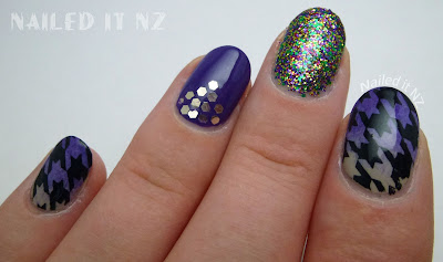 For the pointer and pinky, I stamped on a houndstooth design from a BM-322, which you can see here. I've never done a houndstooth design before and I love it! The stamping worked really well, I'm still enjoying the stamping polishes I got from BPS a while back :D. In the background I sponged on a nude-to-purple gradient.